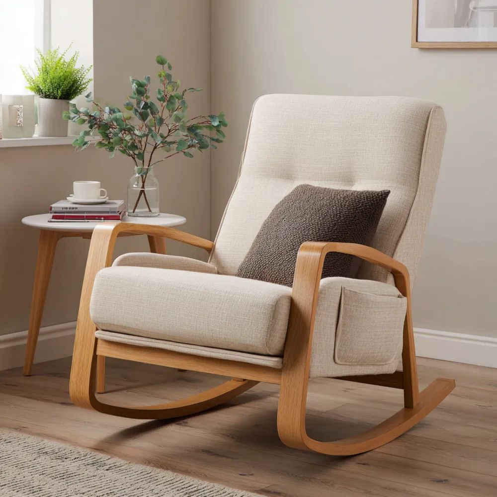 Sedia a dondolo in legno e tessuto - 85x70x95 cm - Beige - Design moderno