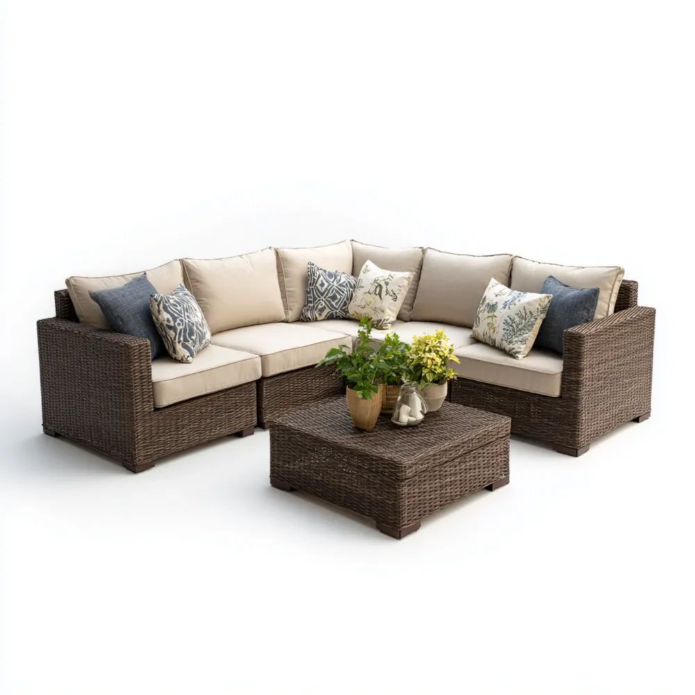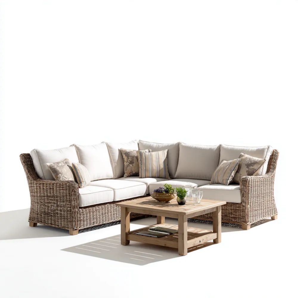 Set di divani da esterno in rattan 250x210x70 cm – Tavolino 80x80x35 cm – Cuscini color Crema – Design moderno