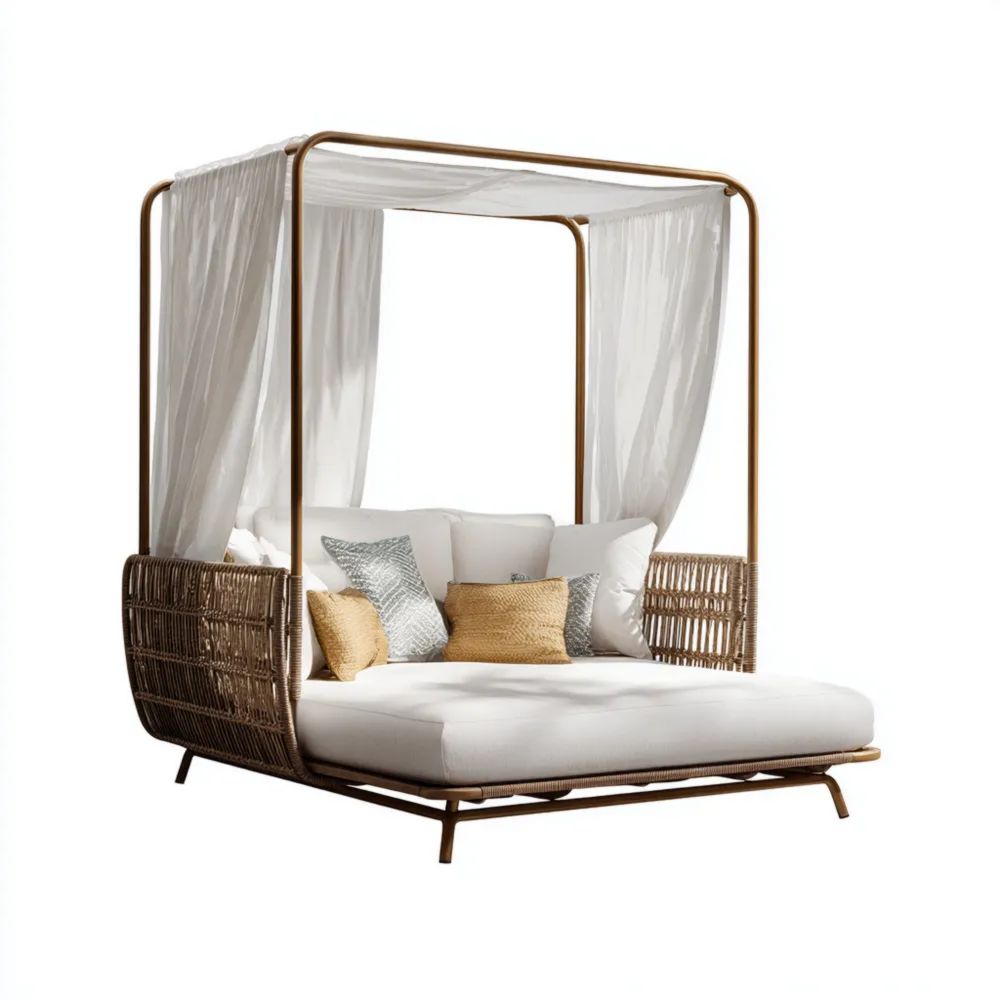Materiale e lavorazioneIl lettino è realizzato in rattan intrecciato di alta qualità, combinato con cuscini in tessuto bianco che offrono un tocco di eleganza e comfort. Il tendalino è in tessuto resistente all'acqua.