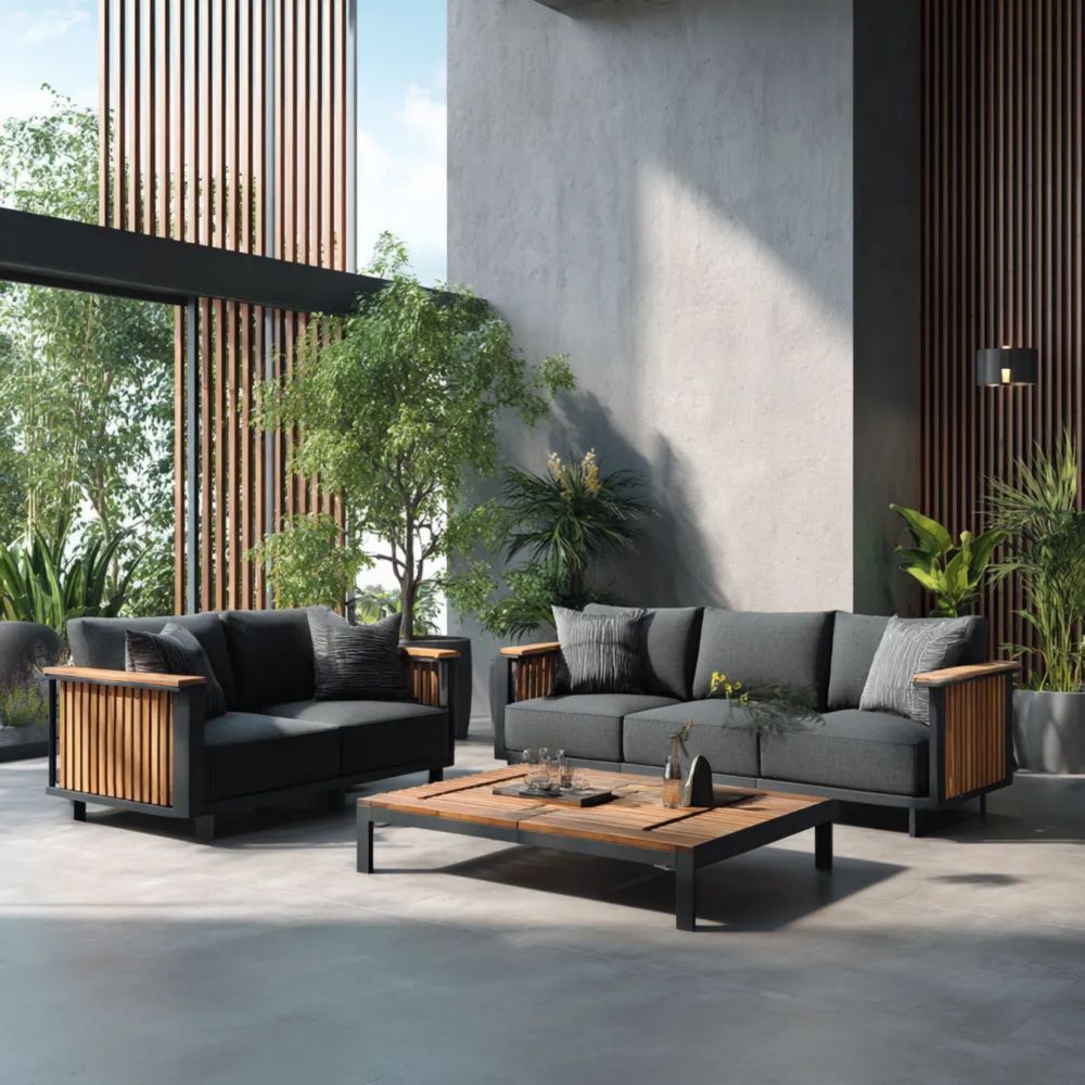 Materiale e lavorazioneRealizzato in tessuto resistente alle intemperie di colore Grigio Scuro con dettagli in legno sui braccioli.