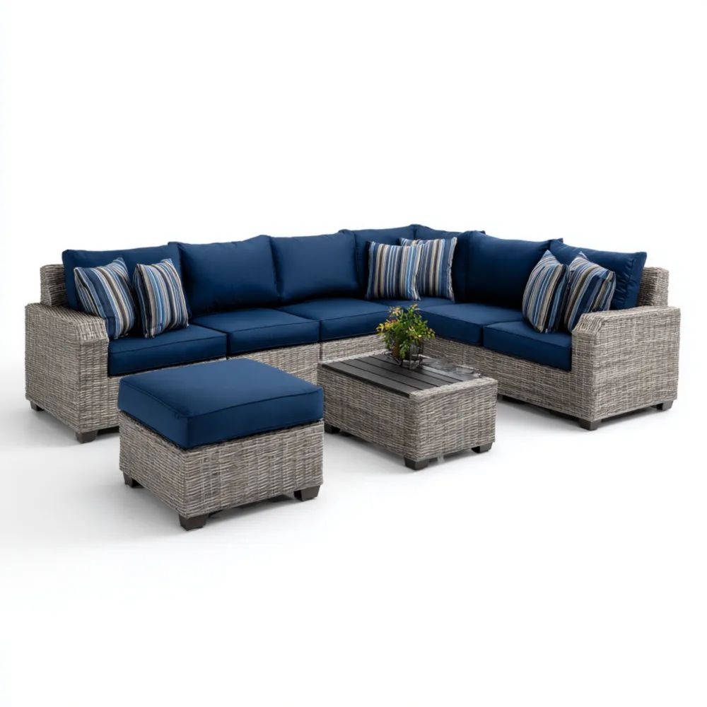 Materiale e lavorazioneRealizzato in resistente rattan con cuscini Blu idrorepellenti, questo set è costruito per durare nel tempo. Il design intrecciato aggiunge un tocco di sofisticazione.
