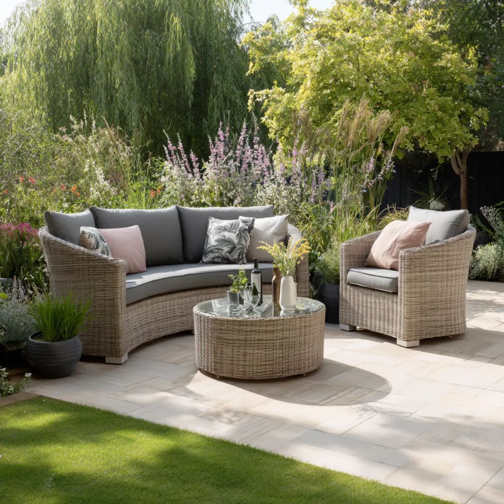 Materiale e lavorazioneRealizzato in robusto rattan sintetico intrecciato, resistente agli agenti atmosferici, con cuscini Grigi per un comfort ottimale. La superficie del tavolino è in vetro temperato.